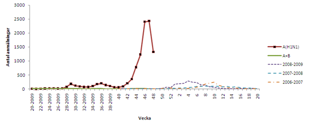 Om det beror på vaccinationen, eller om det beror på något annat (flest antal dödsfall inträffar normalt sett December till Februari, inte så tidigt som November under vanliga influensaperioder) är för tidigt att säga, men glädjande nog ser den här influensavågen ut att vara på väg att lugna ner sig. Nedanstående graf är från SMI. Storleken på staplarna som sådant skall tas med en rejäl nypa salt, höjden beror inte bara på hur många som smittats, utan även på hur många prover man valt att ta. Även om man vet att höjden beror på antalet tagna prov finns det god anledning att tro att den höga stapelns fall nedåt betyder att nuvarande svininfluensavåg är på väg att avta. Man ser i samma diagram att vid normala influensor brukar toppen komma från Decmber fram till mars.
