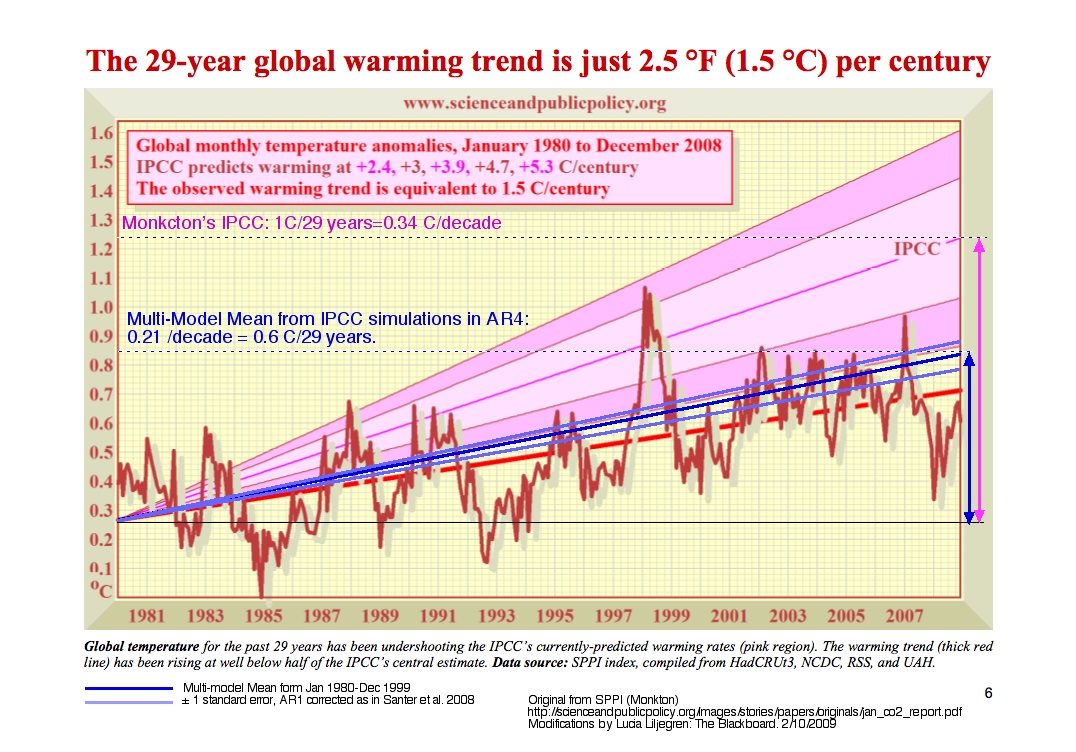 Samtidigt noterar jag att skräckscenariorapporterna kring klimatet som kommer nu återger skräckscenariorna enbart, inga modeller eller data som supportar dem och deras samband med CO2 och jämförelser med naturliga temperaturvariationer, som därmed kan undersökas och verifieras eller motsägas. De tidigare klimatmodellerna var offentliga, och har visat sig ha haft fel i förutsägelserna. Den senast släppta skräckrapporten om CO2 (AVOID) visade sig innehålla vetenskapmännens uttalande att inte ens ett totalt stopp av CO2 skulle leda till en hög sannolikhet att temperaturhöjningen bromsas (naturligt om temperatuhöjningen inte i tillräckligt stor del beror på människans CO2 utsläpp). Ett antal av de kända modellerna har tillfälligt?? försvunnit från CRUs webbsidor. Och DOE, Department of energy ska nu till 8000 anställda i kontakt med CRU skickat ett krav på att allt material kring klimatforskningen skall sparas. Är detta sant? Och i så fall, skulle man gå så långt om man inte hade god skäl att tro att bakom climategate finns det verkliga fel?